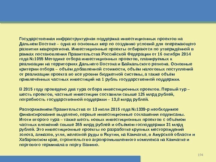 194 Государственная инфраструктурная поддержка инвестиционных проектов на Дальнем Востоке – одна из основных мер по созданию условий для опережающего развития макрорегиона. Инвестиционные проекты отбираются по утверждённой в рамках постановления Правительства Российской Федерации от 16 октября 2014 года № 1055 Методике отбора инвестиционных проектов, планируемых к реализации на территориях Дальнего Востока и Байкальского региона. Основные критерии отбора – объём добавленной стоимости, объём налоговых поступлений от реализации проекта во все уровни бюджетной системы, а также объём привлечённых частных инвестиций на 1 рубль государственной поддержки. В 2015 году проведено два тура отбора инвестиционных проектов. Первый тур – шесть проектов, частные инвестиции составили свыше 126 млрд рублей, потребность государственной поддержки – 13, 8 млрд рублей. Распоряжением Правительства от 13 июля 2015 года № 1339 -р необходимое финансирование выделено, первые инвестиционные соглашения подписаны. Итоги второго тура – также шесть новых инвестиционных проектов с объёмом частных вложений свыше 365 млрд рублей и объёмом господдержки 31 млрд рублей. Это инвестиционные проекты по разработке крупных месторождений золота, алмазов, угля, железной руды в Якутии, на Камчатке, в Амурской области и Хабаровском крае, строительство агропромышленного комплекса на Камчатке и портового терминала в порту Ванино.