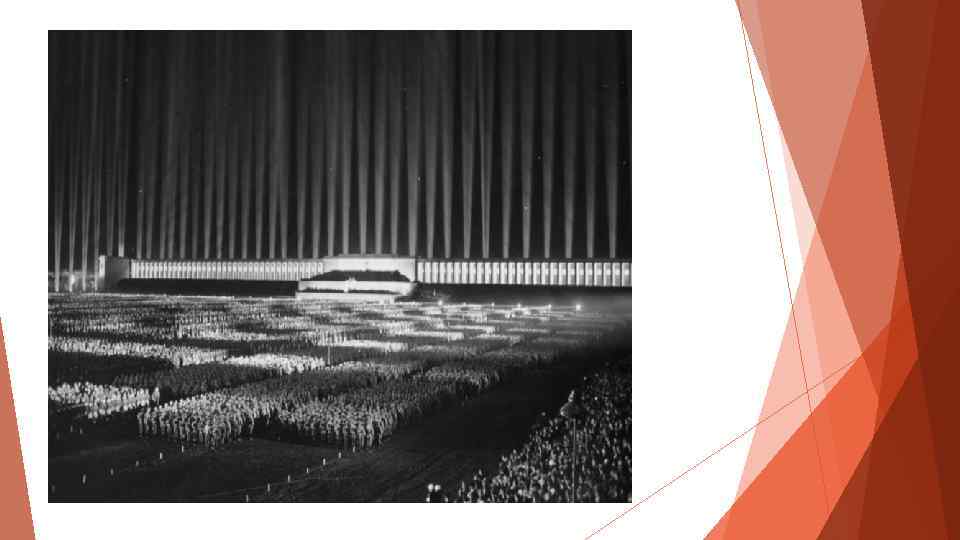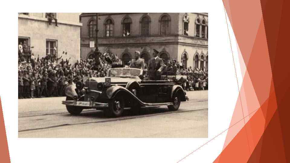 Anfang der Veränderungen (1934 -1938) Nach dem Tod Hindenburgs vereinigt Hitler das Amt des Reichskanzlers mit dem des Reichspräsidenten. • Von dem nach Nürnberg einberufenen Reichstag werden die Nürnberger Rassegesetze verabschiedet. • Hitler empfängt Benito Mussolini in Berlin und entwickelt sein außenpolitisches Allianzsystem. • 1938 übernimmt Hitler den Oberbefehl über die Streitkräfte. • Hitler lässt das Militär extrem Aufrüsten