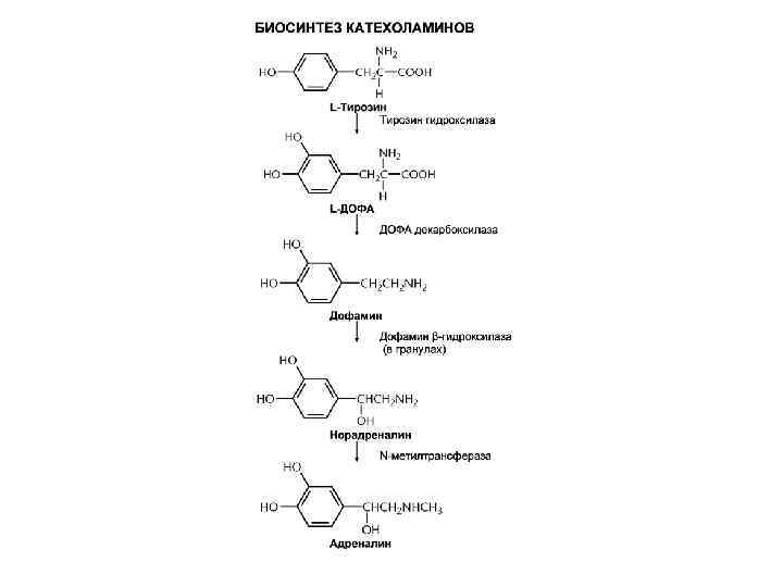 Катехоламины - функции • Норадреналин медиатор в СНС (гл. мышцы, сердце, железы) и в ЦНС • Адреналин надпочечники: 80% Адр. , 20% Нор. • Дофамин медиатор в ЦНС. В СНС – расширяет сосуды почек. В нервной системе кишечника – торможение перистальтики