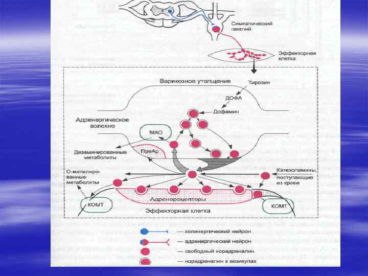 Адренергические синапсы широко представлены в ЦНС и периферической иннервации эффекторных органов. Передача возбуждения в этих синапсах происходит при помощи медиатора норадреналина