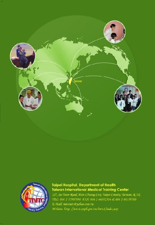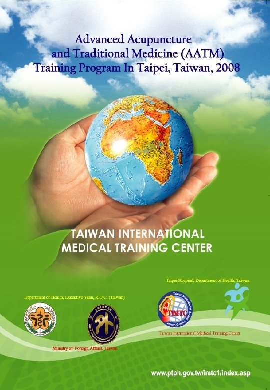 Advanced Acupuncture and Traditional Medicine (AATM) Training Program in Taipei, Taiwan, 2008 For Immediate Release Department of Health in Taiwan and TIMTC (Taiwan International Medical Training Center, Taipei Hospital) are pleased to announce a high level AATM training program. Program Objectives: (1) Provide advanced lectures of acupuncture, moxibustion and traditional medicine. (2) Clinical practice lectures of acupuncture, moxibustion and traditional medicine. (3) Modern concepts of traditional medicine. (4) Integrate the association between medicine and traditional medicine. (5) Share the experiences of herbal medicine on the specific disease as SARS. Qualification: Participants will be health professionals with: (1) 1 year background of acupuncture or traditional medicine. (2) 1~2 recommendation letters. Program Size: Up to 14 fellows will be offered to attend the training program. Program Time: Sep. 14 to 30, 2008. Training Location: Taipei , Taiwan. Certificate: A 80 -credit hours certificate will be awarded by the organizer. Registration Fee: The full registration package includes the invitation to admissions to all sessions, visiting, field trip, teaching materials, coffee breaks and welcome reception. USD$1, 300/ person Deadline for Application: June 30, 2008. Contact Us TEL: 886 -2 -55907998 Fax: 886 -2 -66352516 & 886 -2 -66358700 E-Mail: imtc@yahoo. com. tw Website: http: //www. ptph. gov. tw/imtc 1/index. asp Taipei Hospital, Department of Health, Taiwan