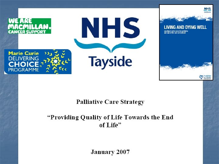 Care settings Home Community Hospitals University Hospitals Angus Dundee City Perth & Kinross 9 Community Hospitals Ninewells Hospital Perth Royal Infirmary Stracathro Hosp 100+ Care Homes Children’s Hospice (independent )