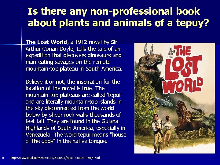 Is there any non-professional book about plants and animals of a tepuy? The Lost World, a 1912 novel by Sir Arthur Conan Doyle, tells the tale of an expedition that discovers dinosaurs and man-eating savages on the remote mountain-top plateau in South America. Believe it or not, the inspiration for the location of the novel is true. The mountain-top plateaus are called 'tepui' and are literally mountain-top islands in the sky disconnected from the world below by sheer rock walls thousands of feet tall. They are found in the Guiana Highlands of South America, especially in Venezuela. The word tepui means "house of the gods" in the native tongue. n http: //www. madcaptravels. com/2010/11/tepui-islands-in-sky. html
