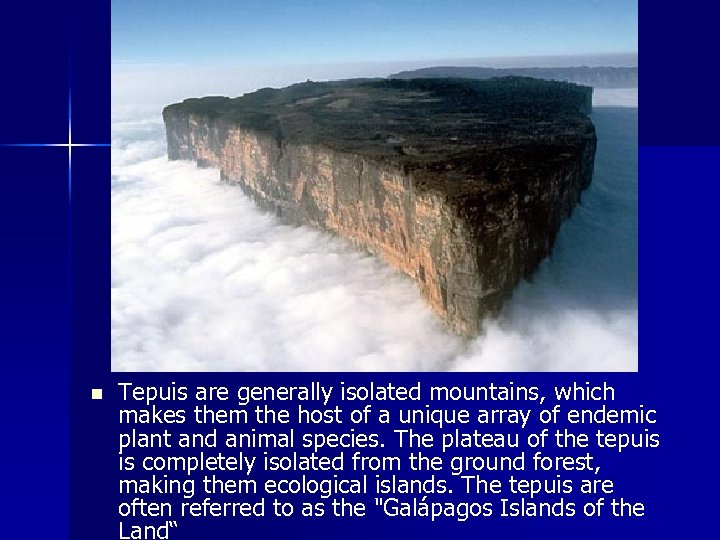 n Tepuis are generally isolated mountains, which makes them the host of a unique array of endemic plant and animal species. The plateau of the tepuis is completely isolated from the ground forest, making them ecological islands. The tepuis are often referred to as the "Galápagos Islands of the Land“