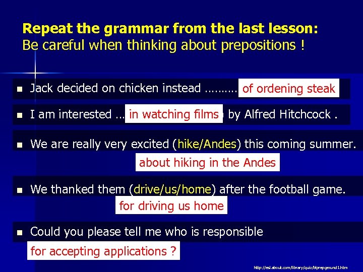 Repeat the grammar from the last lesson: Be careful when thinking about prepositions ! n Jack decided on chicken instead ……………. . (order/steak). of ordening steak ( n I am interested ………… (watch/film) by Alfred Hitchcock. in watching films ( n We are really very excited (hike/Andes) this coming summer. about hiking in the Andes n We thanked them (drive/us/home) after the football game. for driving us home n Could you please tell me who is responsible (accept/applications)? for accepting applications ? http: //esl. about. com/library/quiz/blprepgerund 1. htm