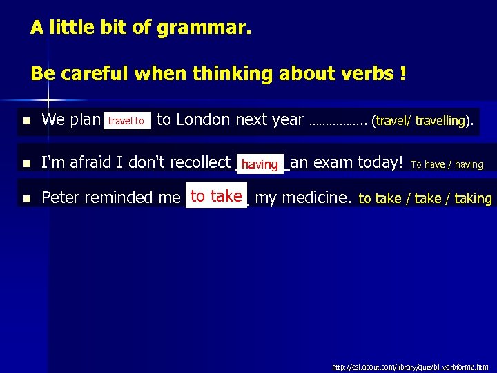 A little bit of grammar. Be careful when thinking about verbs ! n travel to We plan _____ to London next year ……………. . (travel/ travelling). ( n I'm afraid I don't recollect ______an exam today! having n to take Peter reminded me _______ my medicine. to take / taking To have / having http: //esl. about. com/library/quiz/bl_verbform 2. htm