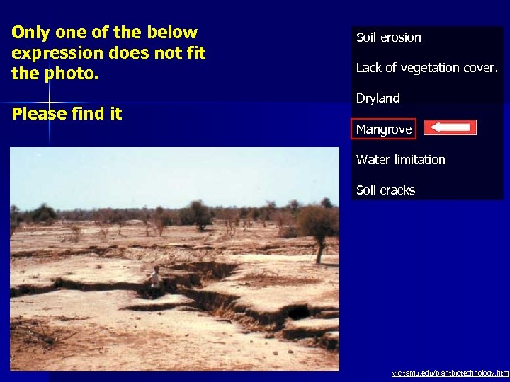 Only one of the below expression does not fit the photo. Please find it Soil erosion Lack of vegetation cover. Dryland Mangrove Water limitation Soil cracks vic. tamu. edu/plantbiotechnology. htm
