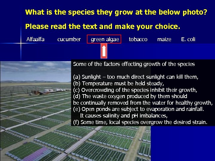 What is the species they grow at the below photo? Please read the text and make your choice. Alfaalfa cucumber green algae tobacco maize E. coli Some of the factors effecting growth of the species (a) Sunlight – too much direct sunlight can kill them, (b) Temperature must be held steady, (c) Overcrowding of the species inhibit their growth, (d) The waste oxygen produced by them should be continually removed from the water for healthy growth, (e) Open ponds are subject to evaporation and rainfall. It causes salinity and p. H imbalances, (f) Some time, local species overgrow the desired strain.