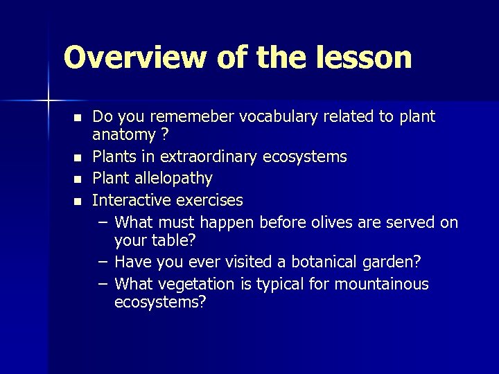 Overview of the lesson n n Do you rememeber vocabulary related to plant anatomy ? Plants in extraordinary ecosystems Plant allelopathy Interactive exercises – What must happen before olives are served on your table? – Have you ever visited a botanical garden? – What vegetation is typical for mountainous ecosystems?
