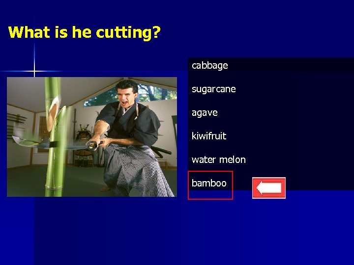What is he cutting? cabbage sugarcane agave kiwifruit water melon bamboo