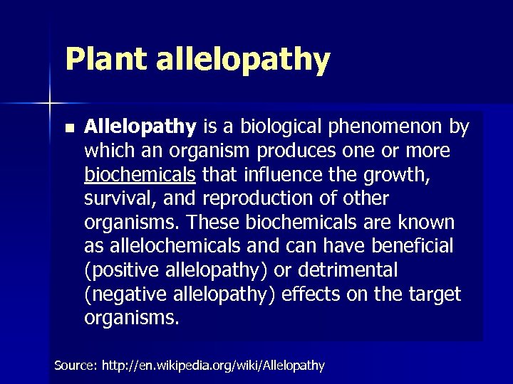 Plant allelopathy n Allelopathy is a biological phenomenon by which an organism produces one or more biochemicals that influence the growth, survival, and reproduction of other organisms. These biochemicals are known as allelochemicals and can have beneficial (positive allelopathy) or detrimental (negative allelopathy) effects on the target organisms. Source: http: //en. wikipedia. org/wiki/Allelopathy