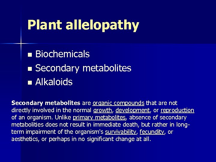 Plant allelopathy Biochemicals n Secondary metabolites n Alkaloids n Secondary metabolites are organic compounds that are not directly involved in the normal growth, development, or reproduction of an organism. Unlike primary metabolites, absence of secondary metabolities does not result in immediate death, but rather in longterm impairment of the organism's survivability, fecundity, or aesthetics, or perhaps in no significant change at all.