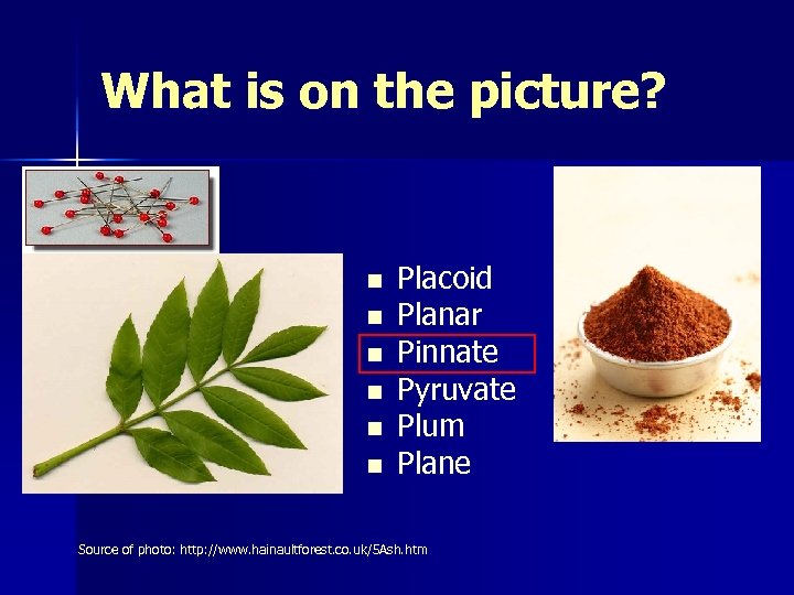 What is on the picture? n n n Placoid Planar Pinnate Pyruvate Plum Plane Source of photo: http: //www. hainaultforest. co. uk/5 Ash. htm