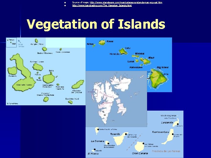 n n Source of maps: http: //www. planetware. com/map/galapagos-islands-map-ecu-gal. htm maps: http: //www. kapotrading. com/The_Hawaiian_Islands. html Vegetation of Islands