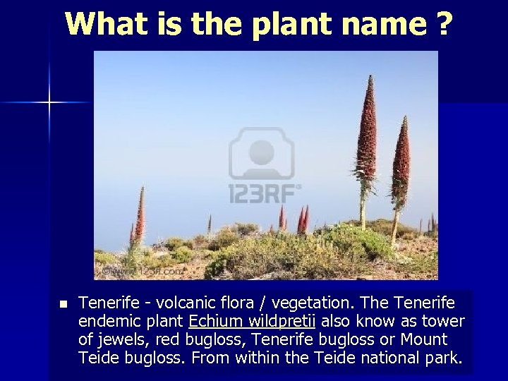What is the plant name ? n Tenerife - volcanic flora / vegetation. The Tenerife endemic plant Echium wildpretii also know as tower of jewels, red bugloss, Tenerife bugloss or Mount Teide bugloss. From within the Teide national park.