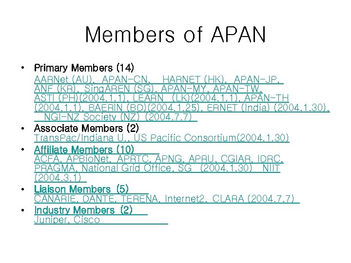 Members of APAN • Primary Members (14) AARNet (AU), APAN-CN, HARNET (HK), APAN-JP, ANF (KR), Sing. AREN (SG), APAN-MY, APAN-TW, ASTI (PH)(2004. 1. 1), LEARN (LK)(2004. 1. 1), APAN-TH (2004. 1. 1), BAERIN (BD)(2004. 1. 25), ERNET (India) (2004. 1. 30), NGI-NZ Society (NZ) (2004. 7. 7) • Associate Members (2) Trans. Pac/Indiana U. , US Pacific Consortium(2004. 1. 30) • Affiliate Members (10) ACFA, APBio. Net, APRTC, APNG, APRU, CGIAR, IDRC, PRAGMA, National Grid Office, SG (2004. 1. 30) NIIT (2004. 3. 1) • Liaison Members (5) CANARIE, DANTE, TERENA, Internet 2, CLARA (2004. 7. 7) • Industry Members (2) Juniper, Cisco