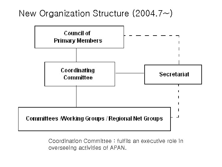 New Organization Structure (2004. 7~) Coordination Committee : fulfils an executive role in overseeing activities of APAN.