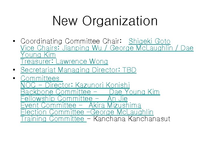 New Organization • Coordinating Committee Chair: Shigeki Goto Vice Chairs: Jianping Wu / George Mc. Laughlin / Dae Young Kim Treasurer: Lawrence Wong • Secretariat Managing Director: TBD • Committees NOC - Director: Kazunori Konishi Backbone Committee - Dae Young Kim Fellowship Committee - An Jie Event Committee - Akira Mizushima Election Committee –George Mc. Laughlin Training Committee - Kanchanasut