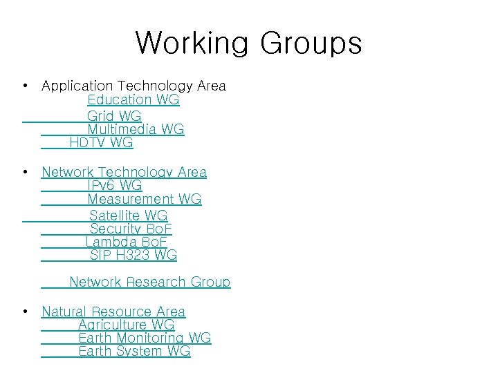 Working Groups • Application Technology Area Education WG Grid WG Multimedia WG HDTV WG • Network Technology Area IPv 6 WG Measurement WG Satellite WG Security Bo. F Lambda Bo. F SIP H 323 WG Network Research Group • Natural Resource Area Agriculture WG Earth Monitoring WG Earth System WG