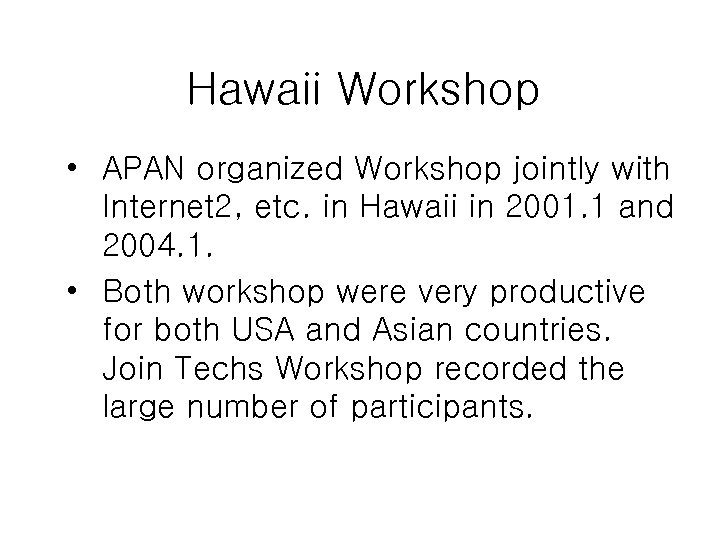 Hawaii Workshop • APAN organized Workshop jointly with Internet 2, etc. in Hawaii in 2001. 1 and 2004. 1. • Both workshop were very productive for both USA and Asian countries. Join Techs Workshop recorded the large number of participants.