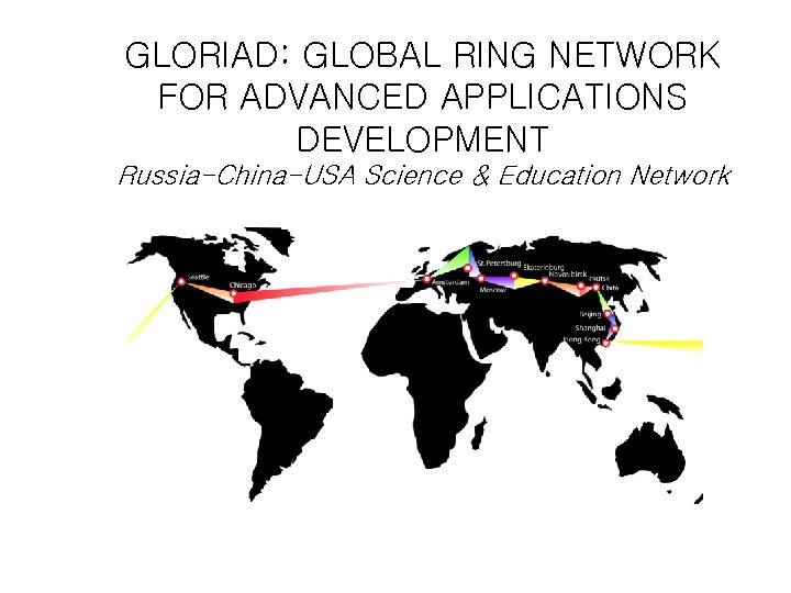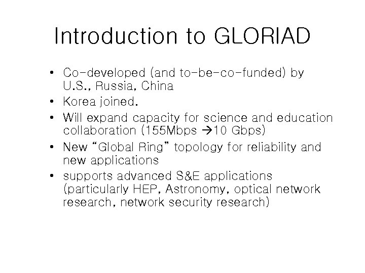 Introduction to GLORIAD • Co-developed (and to-be-co-funded) by U. S. , Russia, China • Korea joined. • Will expand capacity for science and education collaboration (155 Mbps 10 Gbps) • New “Global Ring” topology for reliability and new applications • supports advanced S&E applications (particularly HEP, Astronomy, optical network research, network security research)