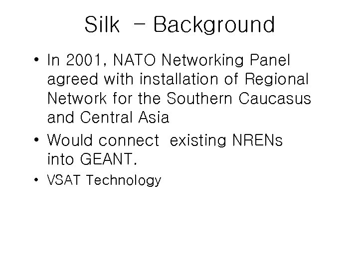 Silk – Background • In 2001, NATO Networking Panel agreed with installation of Regional Network for the Southern Caucasus and Central Asia • Would connect existing NRENs into GEANT. • VSAT Technology