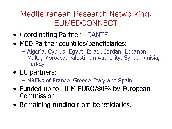 Mediterranean Research Networking: EUMEDCONNECT • Coordinating Partner - DANTE • MED Partner countries/beneficiaries: – Algeria, Cyprus, Egypt, Israel, Jordan, Lebanon, Malta, Morocco, Palestinian Authority, Syria, Tunisia, Turkey • EU partners: – NRENs of France, Greece, Italy and Spain • Funded up to 10 M EURO/80% by European Commission • Remaining funding from beneficiaries.
