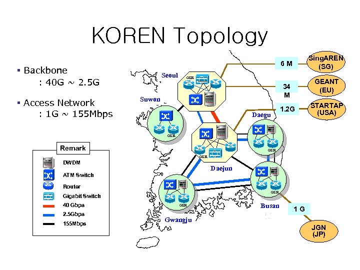 KOREN Topology § Backbone : 40 G ~ 2. 5 G § Access Network : 1 G ~ 155 Mbps Sing. AREN (SG) 6 M Seoul GSR GEANT (EU) 34 M Suwon Daegu 1. 2 G STARTAP (USA) GSR Remark GSR DWDM Daejun ATM Switch Router GSR Gigabit Switch 40 Gbps 2. 5 Gbps 155 Mbps GSR Gwangju Busan 1 G JGN (JP)