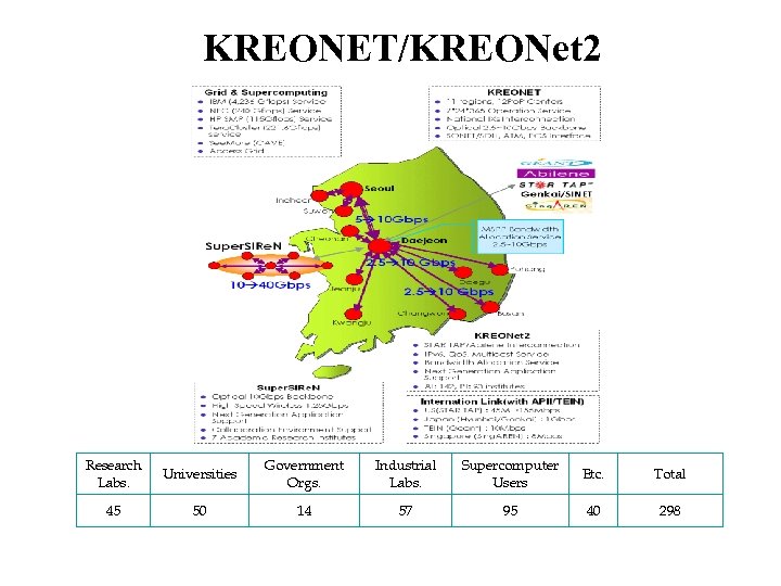 KREONET/KREONet 2 Research Labs. Universities Government Orgs. Industrial Labs. Supercomputer Users Etc. Total 45 50 14 57 95 40 298