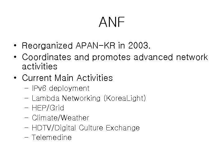 ANF • Reorganized APAN-KR in 2003. • Coordinates and promotes advanced network activities • Current Main Activities – – – IPv 6 deployment Lambda Networking (Korea. Light) HEP/Grid Climate/Weather HDTV/Digital Culture Exchange Telemedine