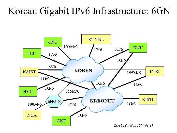 Korean Gigabit IPv 6 Infrastructure: 6 GN CNU ICU KT TNL 155 M/6 1 G/6 KNU 1 G/6 KOREN KAIST 1 G/6 HYU 100 M/6 1 G/6 ETRI 155 M/6 1 G/6 155 M/6 6 NGIX NCA KREONET 1 G/6 KISTI 1 G/6 GIST Last Updated at 2004 -06 -17