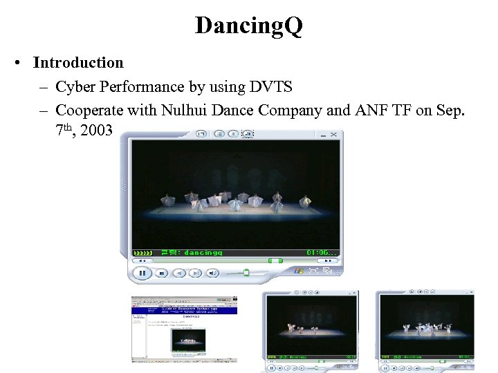 Dancing. Q • Introduction – Cyber Performance by using DVTS – Cooperate with Nulhui Dance Company and ANF TF on Sep. 7 th, 2003
