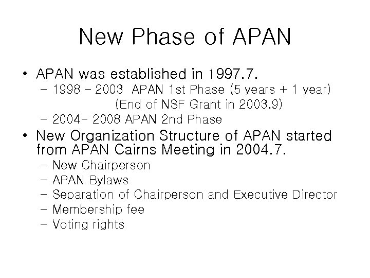 New Phase of APAN • APAN was established in 1997. 7. – 1998 – 2003 APAN 1 st Phase (5 years + 1 year) (End of NSF Grant in 2003. 9) – 2004 - 2008 APAN 2 nd Phase • New Organization Structure of APAN started from APAN Cairns Meeting in 2004. 7. – – – New Chairperson APAN Bylaws Separation of Chairperson and Executive Director Membership fee Voting rights