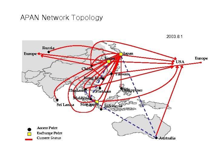 APAN Network Topology 2003. 8. 1 Europe Russia l Japan Korea l l China Hong Kong l Thailandl Access Point Exchange Point Current Status l Taiwan l Vietnam Malaysial l l Singapore Sri Lanka l USA l Philippines Indonesia l Australia Europe