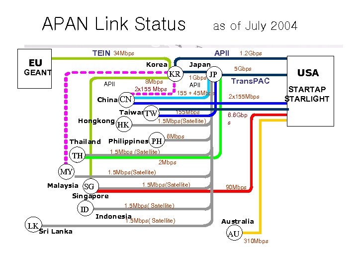 APAN Link Status TEIN EU APII 34 Mbps Korea GEANT 8 Mbps 2 x 155 Mbps APII Japan KR Hongkong HK Philippines 155 Mbps 1. 5 Mbps(Satellite) PH 1. 2 Gbps 5 Gbps Trans. PAC 2 x 155 Mbps 6. 6 Gbp s 6 Mbps 1. 5 Mbps (Satellite) TH 2 Mbps MY Malaysia Taiwan. TW JP 1 Gbps APII 155 + 45 Mbps China CN Thailand as of July 2004 1. 5 Mbps(Satellite) SG 90 Mbps Singapore ID LK 1. 5 Mbps( Satellite) Indonesia 1. 5 Mbps( Satellite) Sri Lanka Australia AU 310 Mbps USA STARTAP STARLIGHT