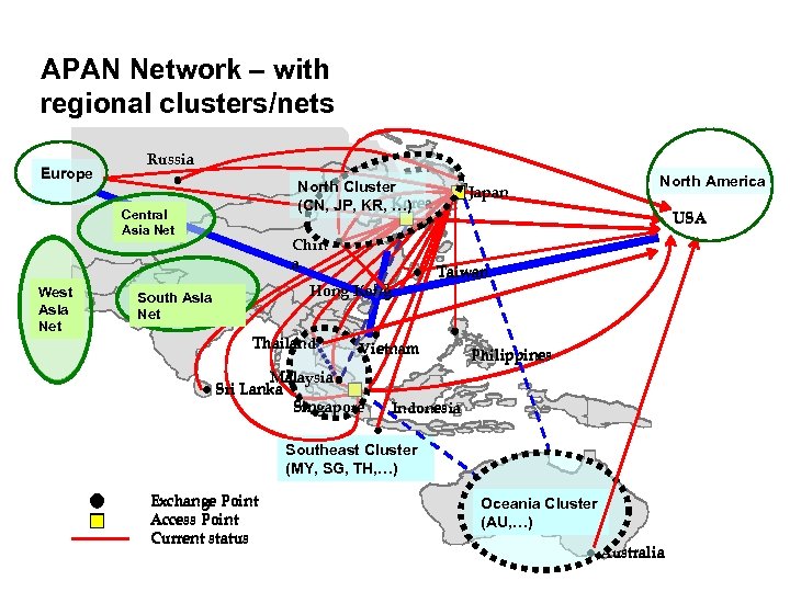 APAN Network – with regional clusters/nets Europe Russia North Cluster (CN, JP, KR, Korea …) Central Asia Net West Asia Net North America l Japan USA l China Chin a Hong Kong South Asia Net Thailand Malaysia l Sri Lanka l Taiwan l Vietnam l Singapore Philippines Indonesia Southeast Cluster (MY, SG, TH, …) Exchange Point Access Point Current status Oceania Cluster (AU, …) l Australia