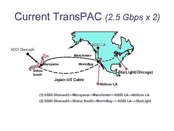Current Trans. PAC (2. 5 Gbps x 2) KDDI LA KDDI Otemachi Manchester Maruyama Morro. Bay Shima South Star. Light(Chicago) Japan-US Cable Abilene LA (1) KDDI Otemachi---Maruyama---Manchester---KDDI LA---Abilene LA (2) KDDI Otemachi---Shima South---Morro. Bay-----KDDI LA----Star. Light