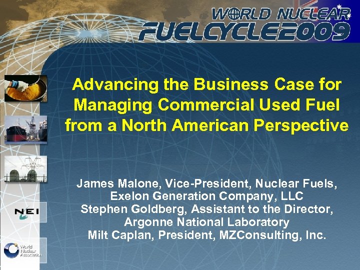 Advancing the Business Case for Managing Commercial Used Fuel from a North American Perspective James Malone, Vice-President, Nuclear Fuels, Exelon Generation Company, LLC Stephen Goldberg, Assistant to the Director, Argonne National Laboratory Milt Caplan, President, MZConsulting, Inc.