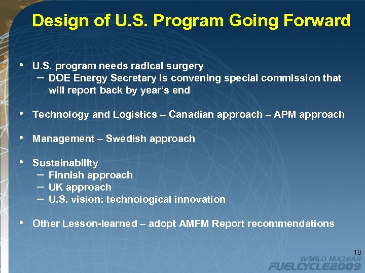 Attributes of the European Program – Significant Progress • Sweden: SKB (owned and operated by the nuclear utilities) established a dedicated fund for managing spent fuel: two components of fee – generating (fees plus interest) and special assessment for the costs for past practices. • Finland: State Nuclear Waste Management Fund – special purpose fund, law requires that the uncertainty of available information about costs and prices shall be taken into account, flexibility to have 10% supplemental contributions to the Fund as well as utilities holding contributions in escrow. • UK Program: New build strategy being developed. Plan is based on once through fuel cycle. Owners are responsible for funding; government is responsible for implementation. UK is striving to build a model that will enable the private sector to build new nuclear plants while ensuring adequate funding for used fuel management. 9