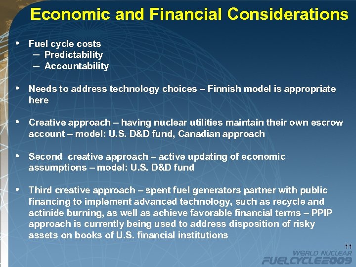 Design of U. S. Program Going Forward • U. S. program needs radical surgery – DOE Energy Secretary is convening special commission that will report back by year’s end • Technology and Logistics – Canadian approach – APM approach • Management – Swedish approach • Sustainability – Finnish approach – UK approach – U. S. vision: technological innovation • Other Lesson-learned – adopt AMFM Report recommendations 10