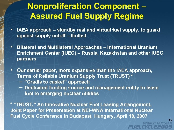 Economic and Financial Considerations • Fuel cycle costs – Predictability – Accountability • Needs to address technology choices – Finnish model is appropriate here • Creative approach – having nuclear utilities maintain their own escrow account – model: U. S. D&D fund, Canadian approach • Second creative approach – active updating of economic assumptions – model: U. S. D&D fund • Third creative approach – spent fuel generators partner with public financing to implement advanced technology, such as recycle and actinide burning, as well as achieve favorable financial terms – PPIP approach is currently being used to address disposition of risky assets on books of U. S. financial institutions 11
