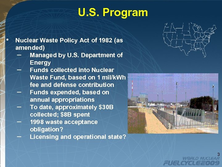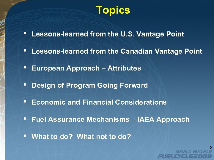 Topics • Lessons-learned from the U. S. Vantage Point • Lessons-learned from the Canadian Vantage Point • European Approach – Attributes • Design of Program Going Forward • Economic and Financial Considerations • Fuel Assurance Mechanisms – IAEA Approach • What to do? What not to do? 2