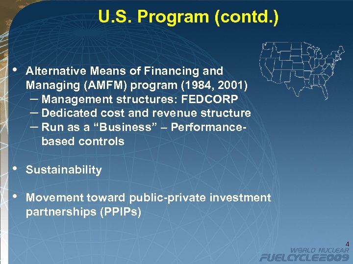 U. S. Program • Nuclear Waste Policy Act of 1982 (as amended) – Managed by U. S. Department of Energy – Funds collected into Nuclear Waste Fund, based on 1 mil/k. Wh fee and defense contribution – Funds expended, based on annual appropriations – To date, approximately $30 B collected; $8 B spent – 1998 waste acceptance obligation? – Licensing and operational state? 3