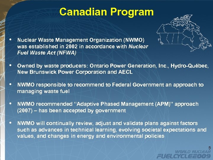 Canadian Program • Nuclear Waste Management Organization (NWMO) was established in 2002 in accordance with Nuclear Fuel Waste Act (NFWA) • Owned by waste producers: Ontario Power Generation, Inc. , Hydro-Québec, New Brunswick Power Corporation and AECL • NWMO responsible to recommend to Federal Government an approach to managing waste fuel • NWMO recommended “Adaptive Phased Management (APM)” approach (2007) – has been accepted by government • NWMO will continually review, adjust and validate plans against factors such as advances in technical learning, evolving societal expectations and values, and changes in energy and environmental policies 5