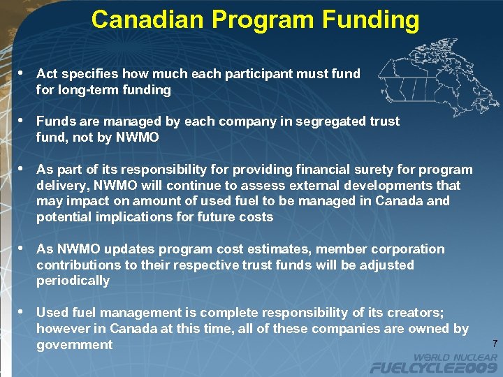 Canadian Program (contd. ) • Phase 1 (30 years): On site dry storage – plan for interim centralized shallow storage • Phase 2 (30 years): Used fuel transferred to centralized repository – planning for final deep geological repository • Phase 3 (60 years): Transfer to deep geological repository – depending on technology of the day – potential for retrieval for reprocessing 6