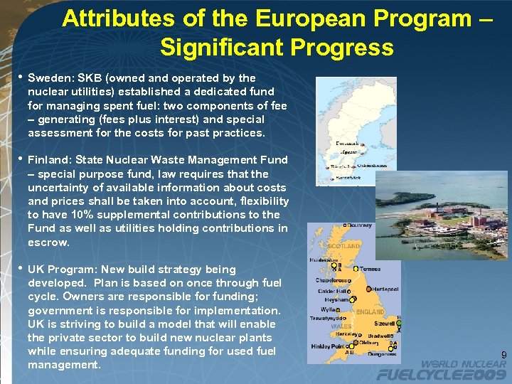 Canadian Program Funding (contd. ) • Should there be new reactors and/or new used fuel owners, it would necessitate review and potential revision to funding formula – Formula would reflect sharing of costs and investments already made by current waste owners, amongst other considerations – Future revisions to funding formula will be done in fair and equitable manner, balancing interests of current and new waste owners • Difficult for new potential plant owners to assess their potential obligation • Not structured to easily accommodate private sector 8