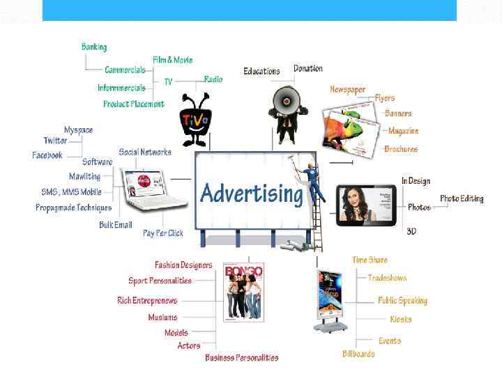 § § § § § Television advertising Music advertising Radio advertising Online advertising New media Press advertising Billboard advertising Aerial advertising In-store advertising