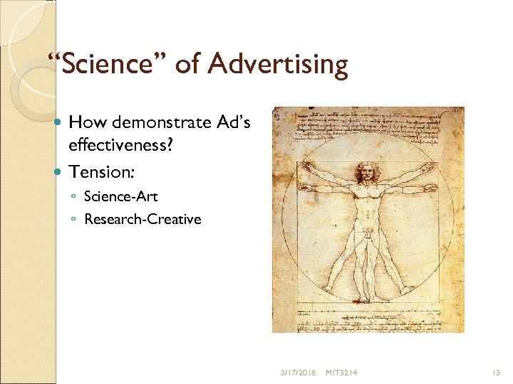 “Science” of Advertising How demonstrate Ad’s effectiveness? Tension: ◦ Science-Art ◦ Research-Creative 3/17/2018 MIT 3214 13