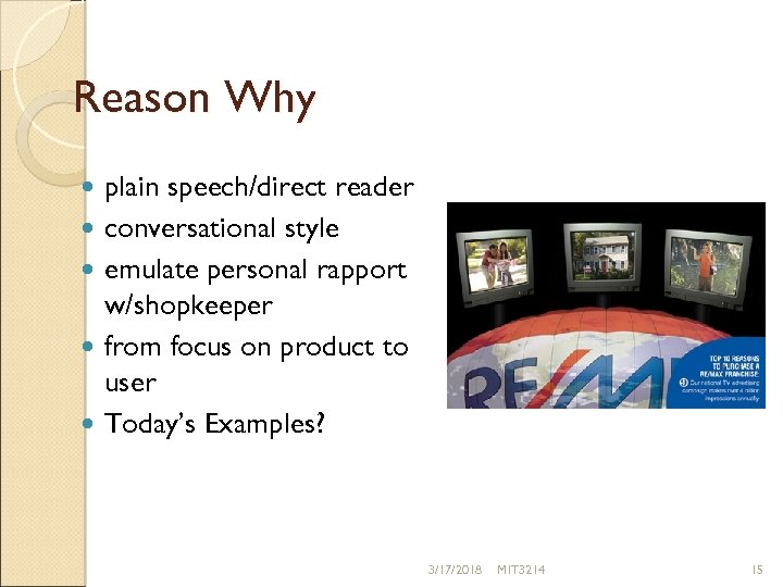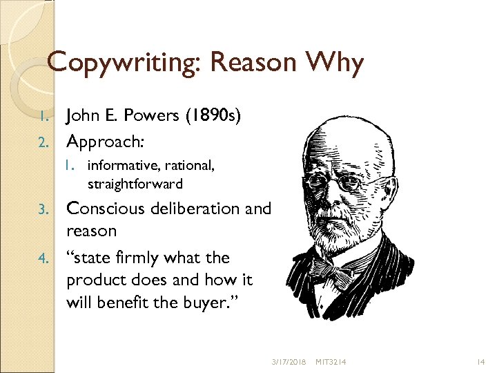 Copywriting: Reason Why John E. Powers (1890 s) 2. Approach: 1. informative, rational, straightforward Conscious deliberation and reason 4. “state firmly what the product does and how it will benefit the buyer. ” 3. 3/17/2018 MIT 3214 14
