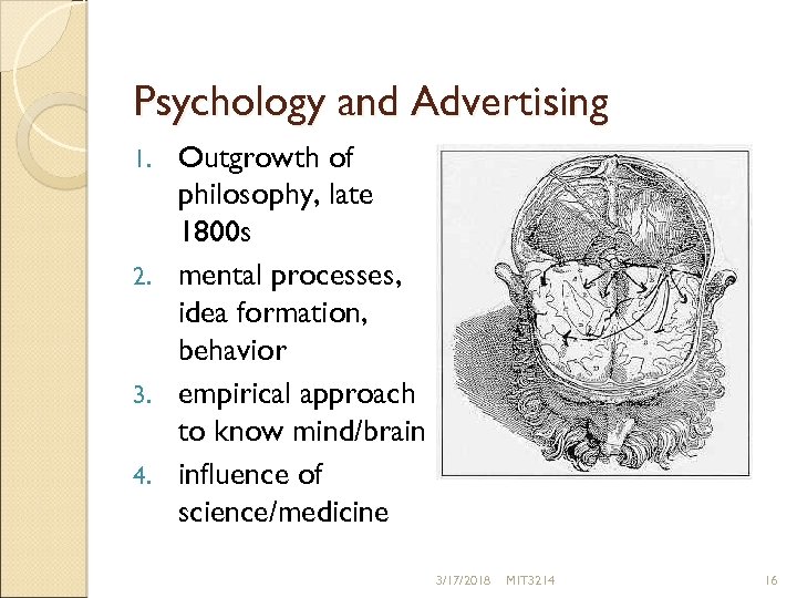 Psychology and Advertising Outgrowth of philosophy, late 1800 s 2. mental processes, idea formation, behavior 3. empirical approach to know mind/brain 4. influence of science/medicine 1. 3/17/2018 MIT 3214 16
